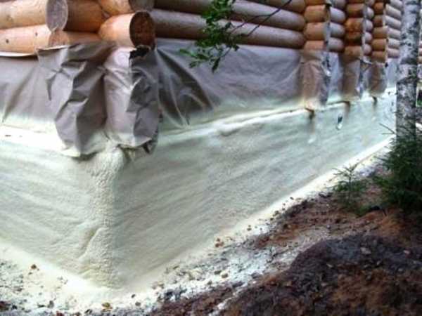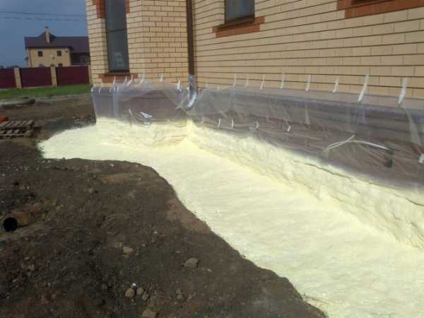Пенополиуретан имеет высокие адгезионные свойства, низкую теплопроводность. Так же отпадает необходимость в пароизоляции и гидроизоляции. Толщина слоя может быть любая, материал после нанесения просто засыпается грунтом. При обработке надземной части цоколя пенополиуретаном, его необходимо оштукатурить, так как он разрушается под действием ультрафиолетового излучения.