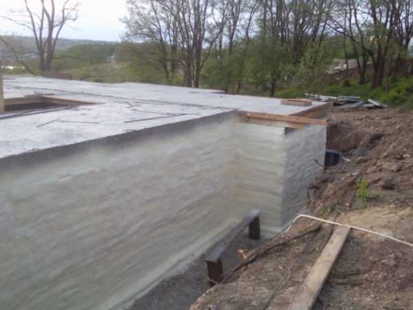 Верхняя часть монолита покрывается жидкой резиной или рубероидом, стыки рулонной гидроизоляции сваривают горелкой.
