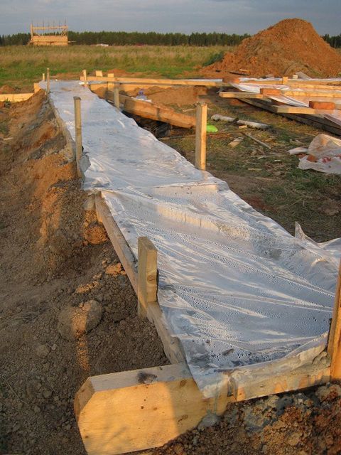 Прикрытие залитого фундамента пленкой- Никто не застрахован от внезапных дождей. Чтобы не допустить размыва неокрепшей поверхности или ее механических повреждений, сразу же после заливки следует укрыть поверхность полиэтиленовой пленкой, мешковиной или брезентом.