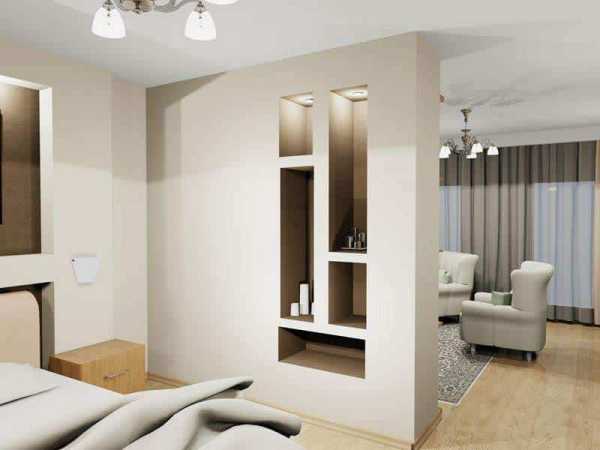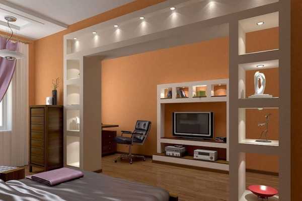 Перегородки из гипсокартона в комнате могут быть произвольной толщины и формы. Их можно комбинировать и с другими элементами интерьера, такими как ниши, полки, аппликации.