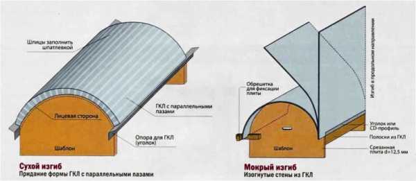Сгибание деталей из ГКЛ потребуется при создании арочных проемов в стене и фигурных элементов перегородки. Используют две основных методики: