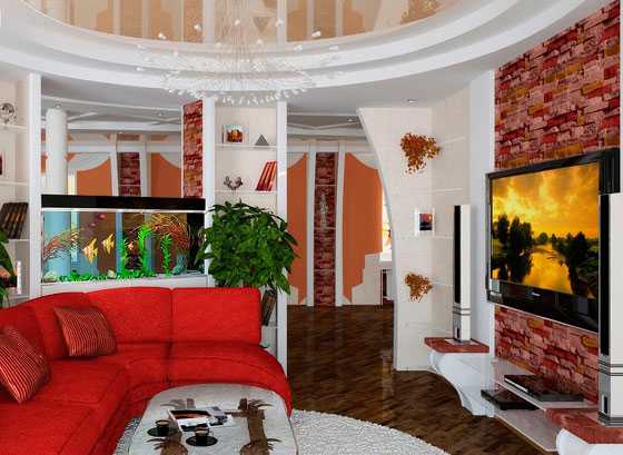 - В гостиной ниша в фальш-стене служит местом для размещения телевизора. А в большой проем можно установить аквариум или даже камин. Преимущество в том, что любоваться игрой пламени или наблюдать за жизнью подводных обитателей можно из любого угла комнаты.