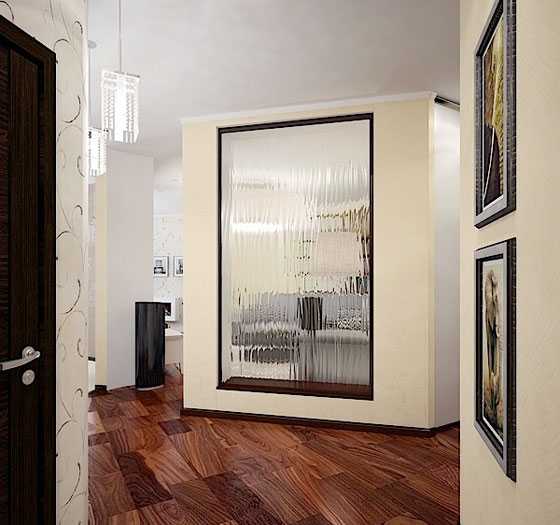 - В темном и узком коридоре недостаточно только двери в перегородке. Чтобы он выглядел просторнее и лучше освещался, желательно сделать оконные проемы. И не обязательно сквозные. Для шумоизоляции их можно остеклить, вставить стеклоблоки или витражное наполнение.