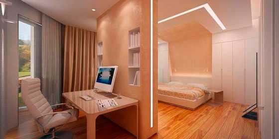 - В рабочей зоне выгодно установить перегородку с множеством полочек, где будут храниться книги, принадлежности для письма, нужные мелочи.