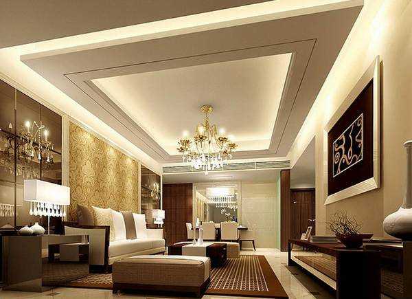 - рамочный потолок – оформление в виде геометрических фигур зачастую правильной формы, имеет одну или две ступени. По фото можно скомпоновать и создать своими руками правильное освещение – по центру разместить люстру, сразу обращающую на себя внимание, а окантовка будет обрамлена светодиодными светильниками. Вся конструкция короба будет иметь толщину не более 50 сантиметров;
