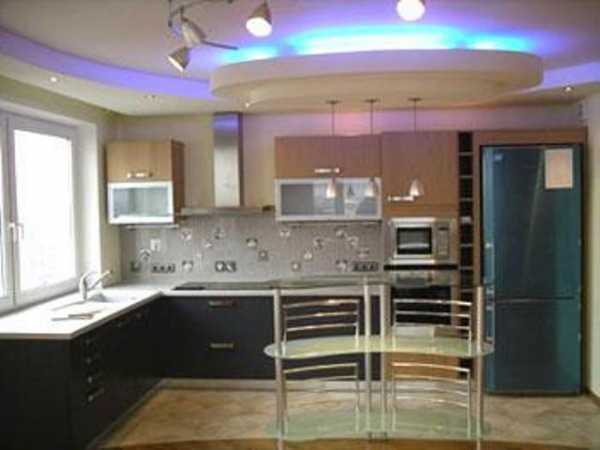 Здесь и яркая подсветка, и необычные для кухонного помещения круглые формы, а вентиляционный канал, в который заведена вытяжка, прекрасно спрятан в одном из ярусов потолочной конструкции.