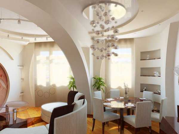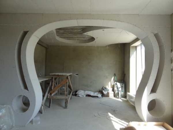 Гипсокартон хоть и прочный материал все-таки дает возможность сформовать из него не только элементы с прямыми гранями, но и полукруглые и волнистые. Это возможно благодаря свойствам гипса. Он при намокании становится несколько податливым и способен гнуться. Именно этот процесс и используется для формирования элементов декорирования в виде арок или круглых проемов. В любом случае все опять-таки начинается с формирования правильного каркаса.