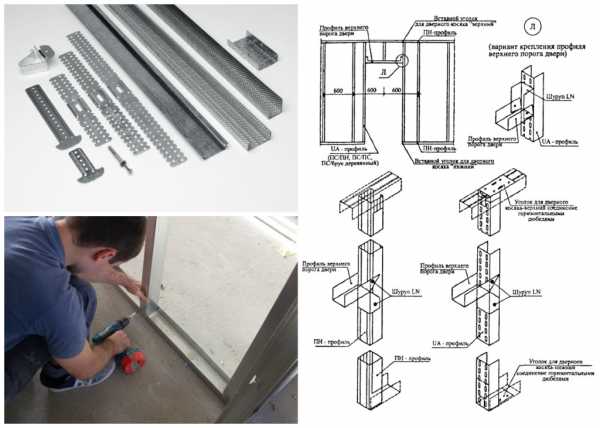 Если планируется делать перегородки с дверью, то по высоте верхнего края дверной коробки нужно прикрепить горизонтальный профиль. Вертикальные стойки и горизонтальную перемычку крепят так, чтобы сплошная сторона профиля бала обращена внутрь проема. Нижнюю основу на месте двери лучше не устанавливать, чтобы потом не пришлось делать порог.