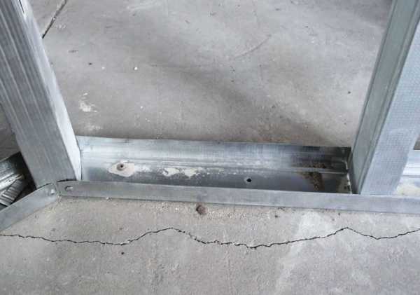 В первую очередь крепят основу будущей перегородки. Она размещается на полу и потолке строго параллельными между собой полосами. Края профиля основы должны находиться на одной вертикальной линии.
