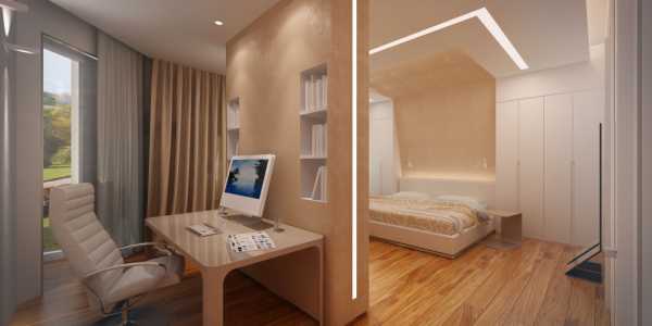 - Высокой перегородкой, но не на всю ширину комнаты, можно отделить рабочий кабинет или гардеробную от спальни. А на нее повесить телевизионную панель.