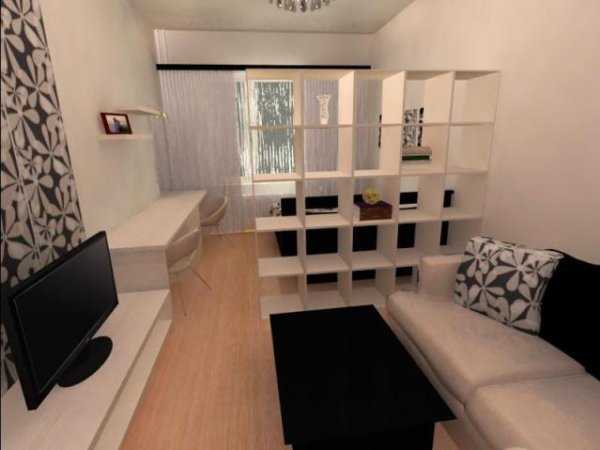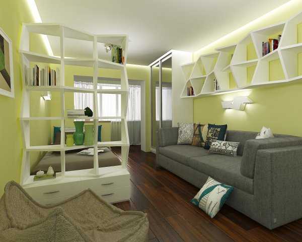 - Ниши в стене или стандартные стеллажи, разграничивающие комнату.