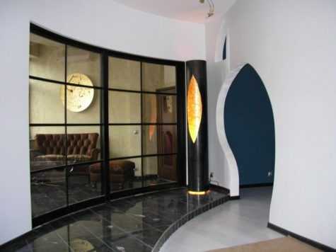 - Интерьер в авангардном стиле предпочитает эллипсоидные арки или конструкции, сочетающие прямые линии и закругленные углы. Отделка может быть любой вплоть до зеркальной мозаики и обоев с футуристическим принтом.
