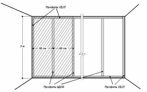 Если проем слишком широкий, то между нижней направляющей и нижней гранью проема ставятся промежуточные стойки из профиля CW на расстоянии 600 мм между серединами.