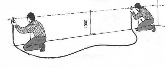 - Необходимо очертить и разметить на потоке место установки каркаса. При помощи уровня найдите самую низкую точку поверхности и от неё отмерьте высоту предполагаемого каркаса. Например, первый уровень будет находиться на расстоянии 5 сантиметров от потолка, а второй – 10;