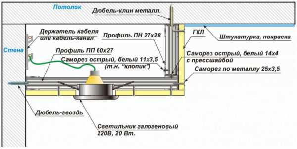 Совет. Проводка под светильники заводится до того, как начнутся работы по облицовке гипсокартоном.