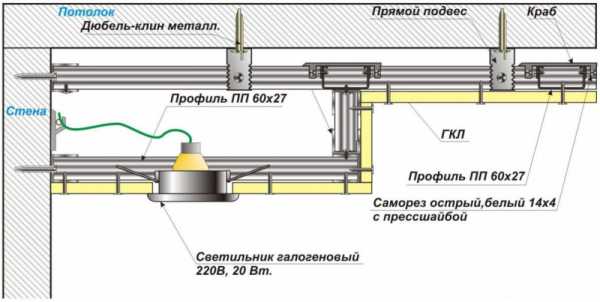 Схема устройства двухуровневого потолка из гипсокартона — первый способ