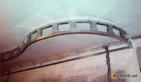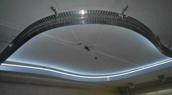 - Дальше вдоль данных линий необходимо закрепить направляющий профиль (ПНП 27х28). Для создания плавного изгиба нужно надрезать 2 смежные стены профиля, и после этого придать необходимую форму. Потом с помощью каждого сегмента нужно прикрепить профиль к потолку.