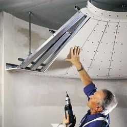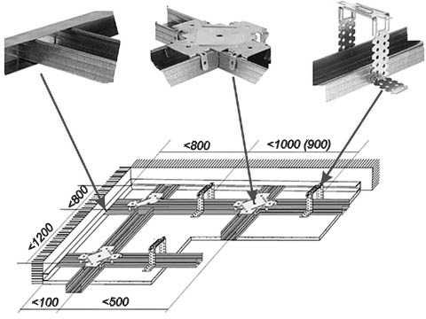 Листы гипсокартона закреплять в центре, за счет подвесов уголков и крестов. Сделать скелет, на который прикрепится гипсокартон. Такая фурнитура может использоваться для связок профиля.