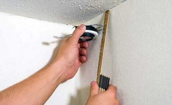 Если изначально по проекту, было задумано, в качестве освещения использовать подвесную люстру, то крепление для нее необходимо смонтировать еще до обшивки металлического каркаса гипсокартоном. Для этого к поверхности бетонной плиты перекрытия с помощью металлических подвесов закрепляют деревянную доску с размерами примерно 20х20 см, толщиной более 30 мм. Далее каркас обшивается ГКЛ, а после обшивке в гипсокартоне сверлят отверстие на 50 мм, сквозь которое в деревянную доску ввинчивают саморез на 200 мм. Через это же отверстия вытягивается кабель для подключения люстры. После этого двумя плоскогубцами торчащий саморез изгибается в виде крючка, на который в дальнейшем и будет повешена подключенная люстра, а сам крючок скрывается декоративной накладкой люстры.