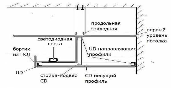 Общая схема двухуровнего потолкаОбшивка гипсокартоном
