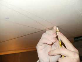 Шнур натереть темным порошком и отбить по диагонали. Провести разметку центра комнаты, компенсировав все неровности потолка и стен. Расчертить линии, продольные скрытым граням второго яруса. Расчертить сетку для подвесов 1 яруса во внутреннем периметре коробов, то есть расставить метки— каждую на 50 см от друг друга по продольным границам обратных двух линий. На остальных линиях расставить точки на 60 см от друг друга. Должен выйти прямой угол по пересеканию всех линий.