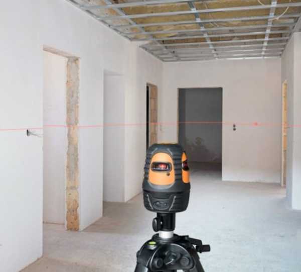 В центре комнаты на треноге устанавливается оптический нивелир, который настраивают на показ горизонтальной линии в единой проекции на всех четырех стенах. Само потолочное перекрытие может быть неровным, но найдя на его плоскости нижнюю точку и, отступив от нее по стене 100 мм, находят «ноль» — уровень плоскости первого яруса потолка. Если монтаж двухуровневого потолка из гипсокартона производится с оптическим нивелиром, то после его регулировки и нахождения «ноля», нивелир должен располагаться на своем неподвижном месте до завершения монтажа направляющего профиля на стенах.