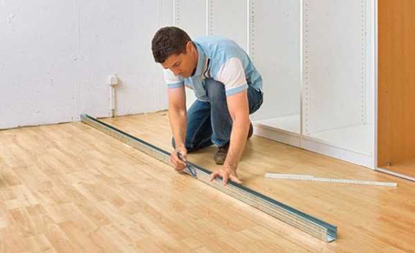 Разметку перегородки выполняют прямо на перекрытиях. В первую очередь отмечают крайние точки каркаса на потолке, так как именно оттуда начинается монтаж конструкции.