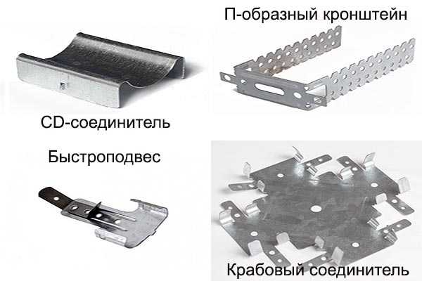 Приспособлениями для закрепления разных типов профилей служат: соединители типа «краб», создающие их перекрёстные перпендикулярные крепления в каркасе, удлинители для различных комбинаций металлических отрезков, анкерные зажимы, подвесы прямые, двухуровневые CD соединители и другие.
