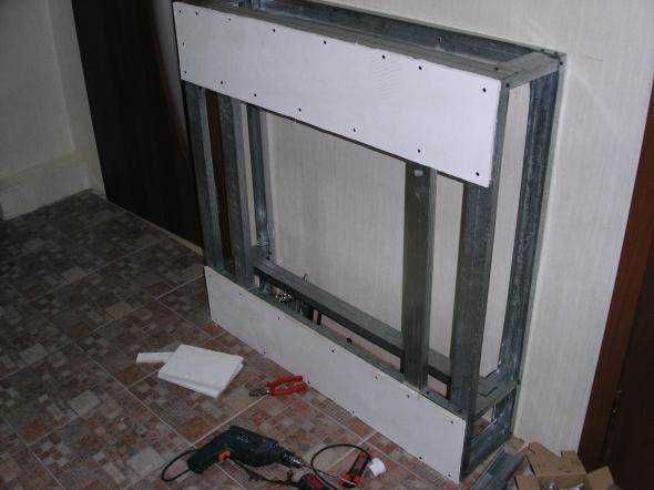 Каркас для камина из гипсокартона возводится из стандартного профиляВсе плоскости обязательно проверяйте отвесом и уровнем, чтобы не было даже малейших отклонений, которые могут пустить весь наш проект под откос. Старайтесь делать все не спеша, и в результате получить короб в форме параллелепипеда.