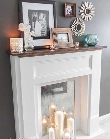 И, наконец, украшение камина. Классический камин невозможно представить без каминной полки, поэтому очень часто при самостоятельном изготовлении фальш-камина конструкцию также дополняют навесной полкой. На ней располагаю всевозможные аксессуары, гармонирующие с общим интерьером комнаты. Дополнительные аксессуары (в виде решетки, искусственных дров, свечей, зеркал и других элементов декора) можно дополнительно расставить на полу около самого камина.