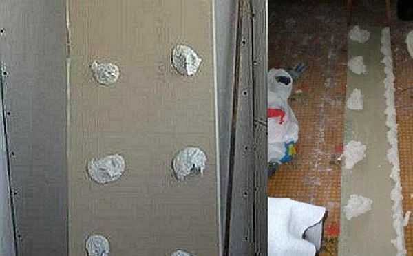 - На листы наносят лепешки из разведенного до состояния пасты состава для работ с гипсокартоном (лучше — финишный, он более «липкий»). Они должны располагаться по периметру и кое-где в середине.