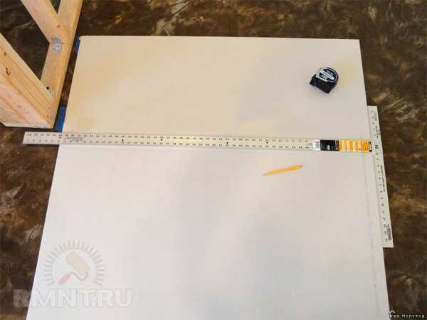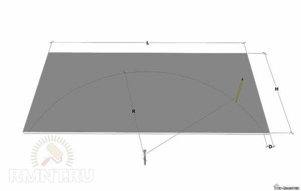 Нам потребуется шнур, 2 самореза и карандаш. Отметим на листе ширину проёма для будущей арки, затем определимся каким радиусом будем скруглять арку в углах.