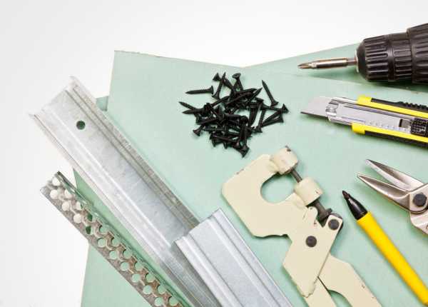Для каркаса необходим металлический направляющий профиль (многие мастера называют его «пэшкой» из-за сходства его формы с буквой «П»). Кроме того, будут нужны ножницы по металлу и дырокол для металла. Не рекомендуется применение самоввинчивающихся шурупов, поскольку с ними гипсокартон неплотно прилегает к каркасу.