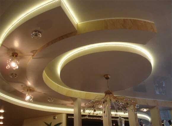 - комбинированное. Очень часто при использовании подвесной конструкции для потолка из гипсокартона или натяжного полотна прибегают к комбинированию открытой и скрытой подсветки. Получается эффектно, красиво и изящно.