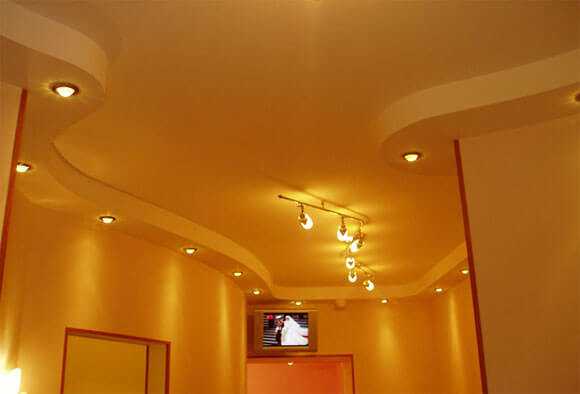 - прихожая представляет собой одно из трудных мест в плане сборки гипсокартонных конструкций и создания своими руками подходящей подсветки. Это связано с тем, что коридор зачастую малогабаритен и извилист, а также заставлен шкафами. Здесь чаще всего используют простые одноуровневые потолочные перекрытия с точечными светильниками, разбросанными по его поверхности. Скрытый тип освещения здесь подойдет в качестве ночной подсветки. Для коридора можно использовать светодиодную ленту, гибкий неон или дюралайт;