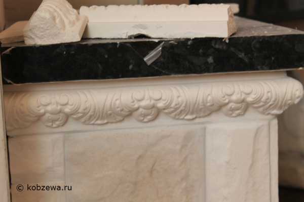 Далее шла более интересная часть – облицовка гипсокартона, чтобы придать фальш камину натуральность. Решено было использовать лепные элементы из гипса: консоль и мини пилястру. Пилястру вытянула из гипса, а консоль отлила с помощью силиконовой формы. Так же для придания декоративности искусственному камину, используя силиконовые формы, отлила гипсовые молдинги с рисунком. Их крепила на шпатлевку под все столешницы и маленькие и большую. Так же как венец прикрепила молдинг и у самого потолка.