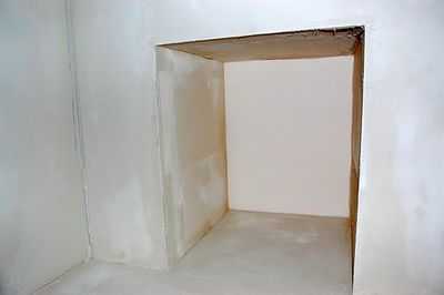 - На стену или в угол и на пол наносятся метки контуров. Карандашом очерчивается отсек, где расположится топка. Линии строго горизонтальные и вертикальные с правильным пересечением;