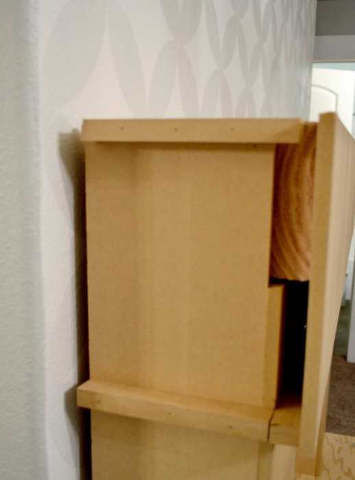 - Сразу же сделайте электропроводку для подсветки. Как вы можете видеть на первом фото, в нашем случае предусмотрено три точки вывода: две на фасаде и одна над полкой. В качестве подсветки используется светодиодная лента.