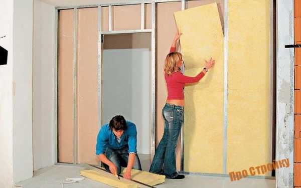 Минеральная вата не только утепляет, но и является дополнительной звукоизоляциейЧтобы минеральная вата лучше держалась, вертикальные перегородки делают из двух ПС, что устанавливаются друг к другу спиной. Так образуются ложбины, в которые заводится утеплитель, и благодаря которому он прочно держится. Также такой каркас будет более прочным, хотя придется потратиться на дополнительный ПС.