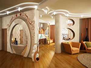 Из гипсокартона можно создавать любые формы: квадрат, овал, волны, ниши, полочки встроенного типа и другие необычные элементы. Отличное решение — межкомнатная перегородка из гипсокартона с дверью.