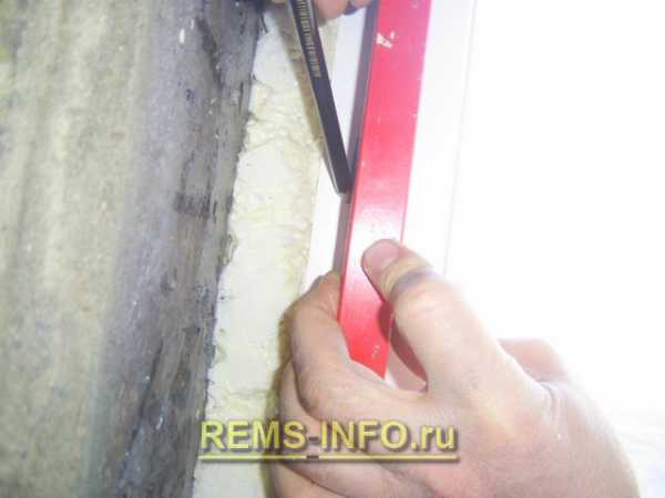 Монтажная пена, расширяясь за счет избыточного давления, заполняет все пустоты в обрабатываемом проеме. Но в ничем не ограниченном пространстве она, застывая, образует выпуклости произвольной формы, которые являются излишками. Они нуждаются в удалении. Вся пена, которая предположительно будет создавать помехи при установке оконных откосов, обрезается с помощью острого строительного ножа.