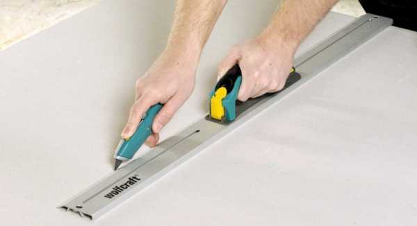 - Затем следует произвести замеры откоса и вырезать необходимый фрагмент гипсокартона специальным ножом, используемым в строительстве.