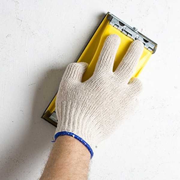 В первую очередь выровняйте все выпуклости, появившиеся в точках укладки клеевой смеси, при помощи специальной терки для работы с гипсокартоном. Углубления нивелируйте при помощи шпаклевки.