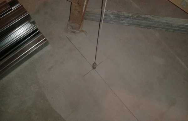 Находят наиболее выступающий участок на поверхности. И если это не наплыв или вздутие штукатурки, которые можно стесать, то такое место принимают за точку отсчета. От нее, немного отступив от стены, с помощью отвеса переносят проекцию «нуля» на пол. Такую же отметку делают на потолке. Поэтому и нужен небольшой зазор, чтобы отвес не «цеплял» стену. Отбивают первую линию на полу, проверяют ее перпендикулярность к примыкающим стенам. Отступив на некоторое расстояние по краям, отмечают следующие точки. Переносят их проекции на потолок.