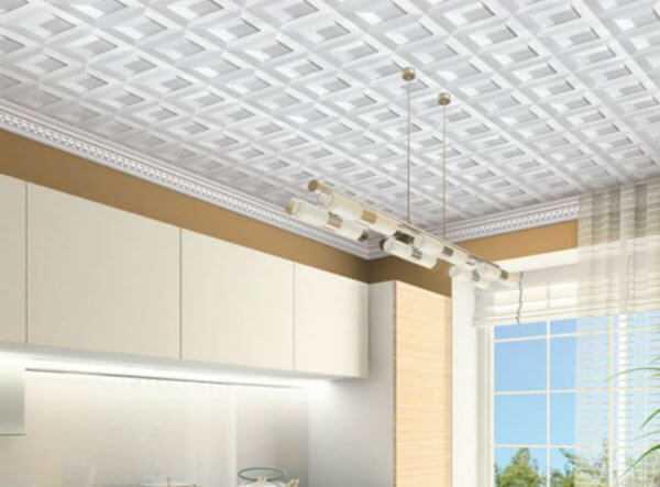 - Плитка из пенополистирола. Рельефная поверхность с рисунком придает декоративный вид потолку, подходит любому интерьеру – от минимализма до классики. Плитка лёгкая, выпускается в разных формах, цветах, ее можно перекрашивать в любой оттенок. Подходит для невысоких помещений.