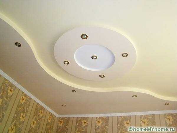 Фигурный двухуровневый потолокА также стоит учесть, что зависимо от запланированного устройства и конфигурации второго яруса, могут понадобиться двухуровневые соединители, или же арочные профили. И не последним, будет понятие того, каким образом согнуть гипсокартон для создания криволинейных нестандартных форм обводов второго уровня потолка.