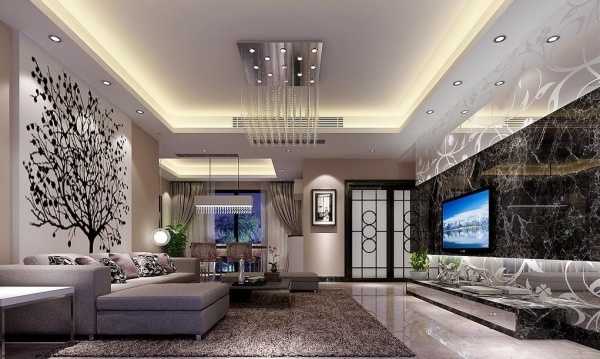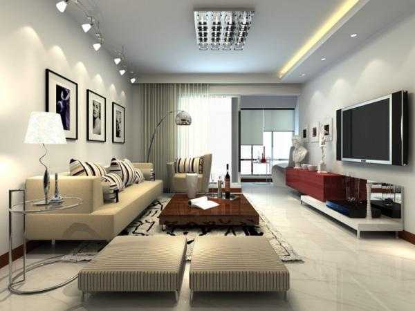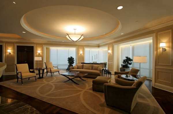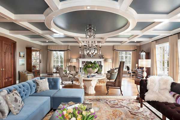 Дизайн потолка должен стилистически соответствовать общей концепции оформления гостиной.