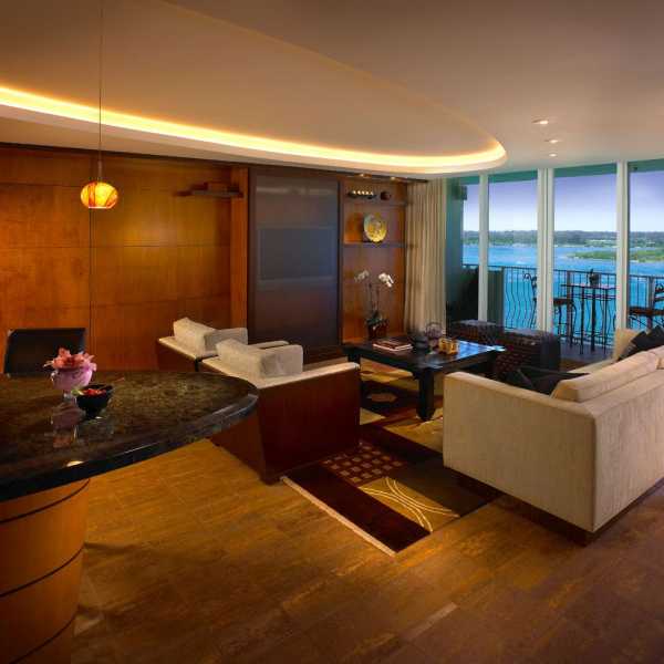 В таких сложных помещениях как кухня-гостиная главным правилом является зонирование. Нужно обязательно визуально отделить зону приготовления еды от зоны отдыха. Для решения этого вопроса можно использовать геометрические фигуры и декоративную подсветку.