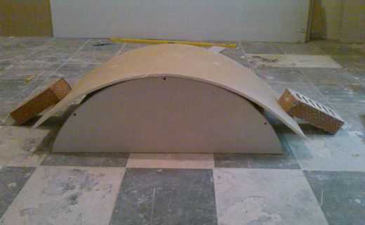 Выгибание гипсокартонаПри необходимости нужно изогнуть заготовки из гипсокартона в требуемую форму. Это можно сделать двумя способами: на сухую по шаблону или на мокрую к каркасу. Сухой метод подразумевает использование предварительно изготовленного шаблона, к которому крепят лист, фиксируя его саморезами. Во втором варианте, гипсокартон с тыльной стороны перфорируют (можно специальным валиком), и смачивают водой, следя затем, чтобы она не просочилась сквозь лицевой слой бумаги.