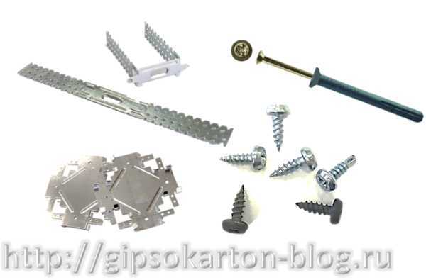 - Крепежи. Для соединения металлических деталей между собой нужно запастись мелкими саморезами – «клопами». А также необходимы дюбели — гвозди или другие подходящие крепежи для монтажа подвесов к основному потолку. Для обшивки потребуются саморезы для ГКЛ длиной минимум 20 мм.